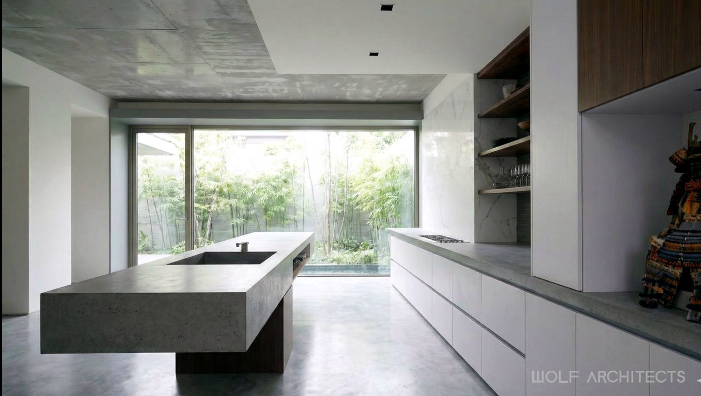 The interior is minimalist and WOLF Architects director Taras Wolf used his expertise, experience and talent for this style to craft pure and simple spaces that in themselves are fine works of art. While many of the perfectly clean minimalist spaces do not lend themselves to clutter and mess, this house has ample storage behind walls of concealed panels. The brief required this to allow the house to be restored to perfect tidiness within minutes by means of putting things aside and covering up. The clients do not plan to live in the house for more than a month each year. Keeping such a house with little use in perfect condition and ready to use at an instance notice was another challenge.
