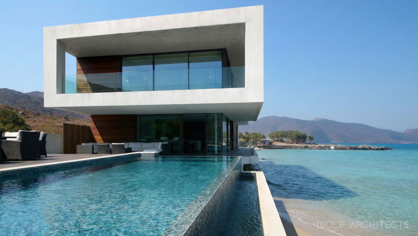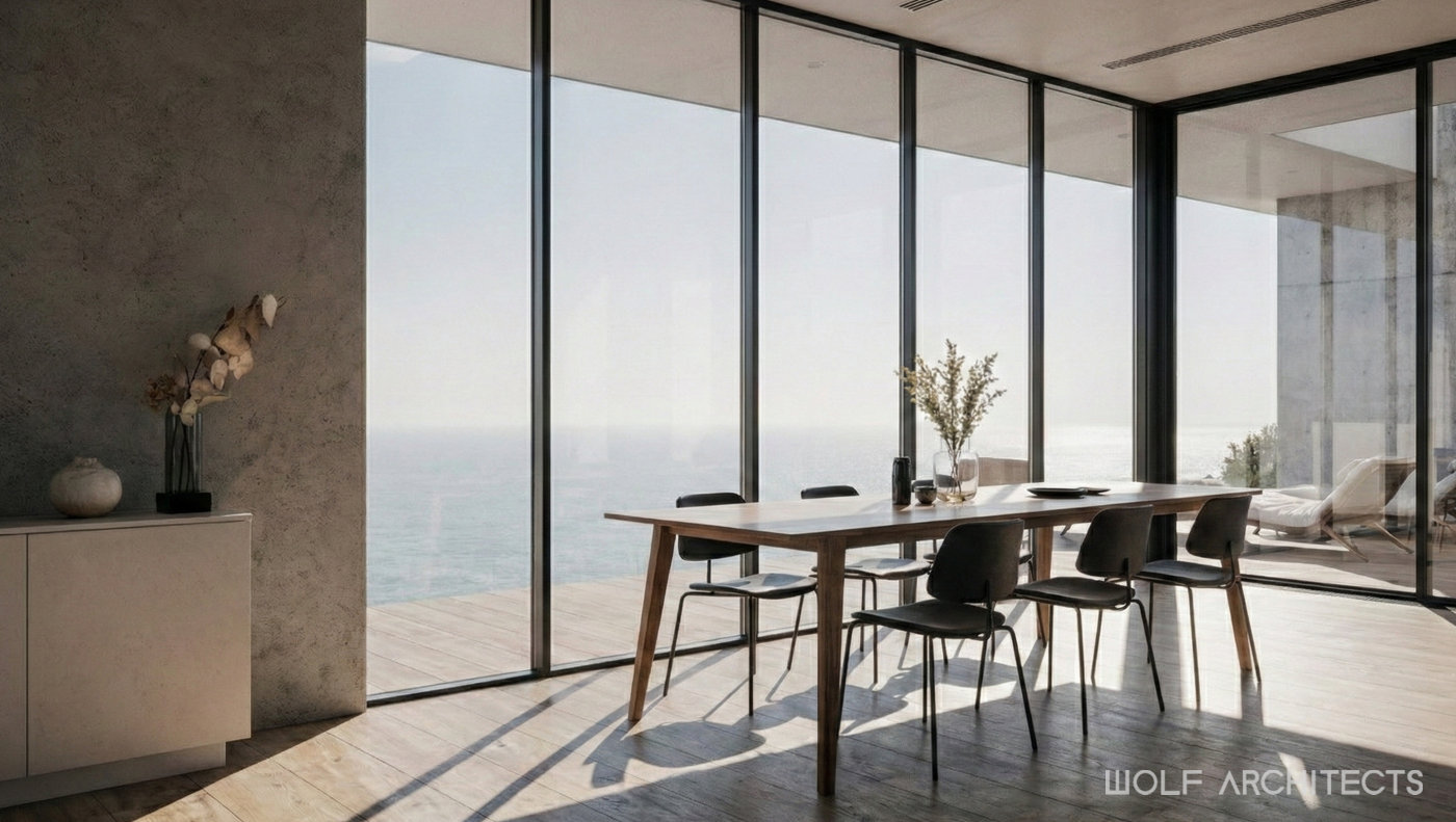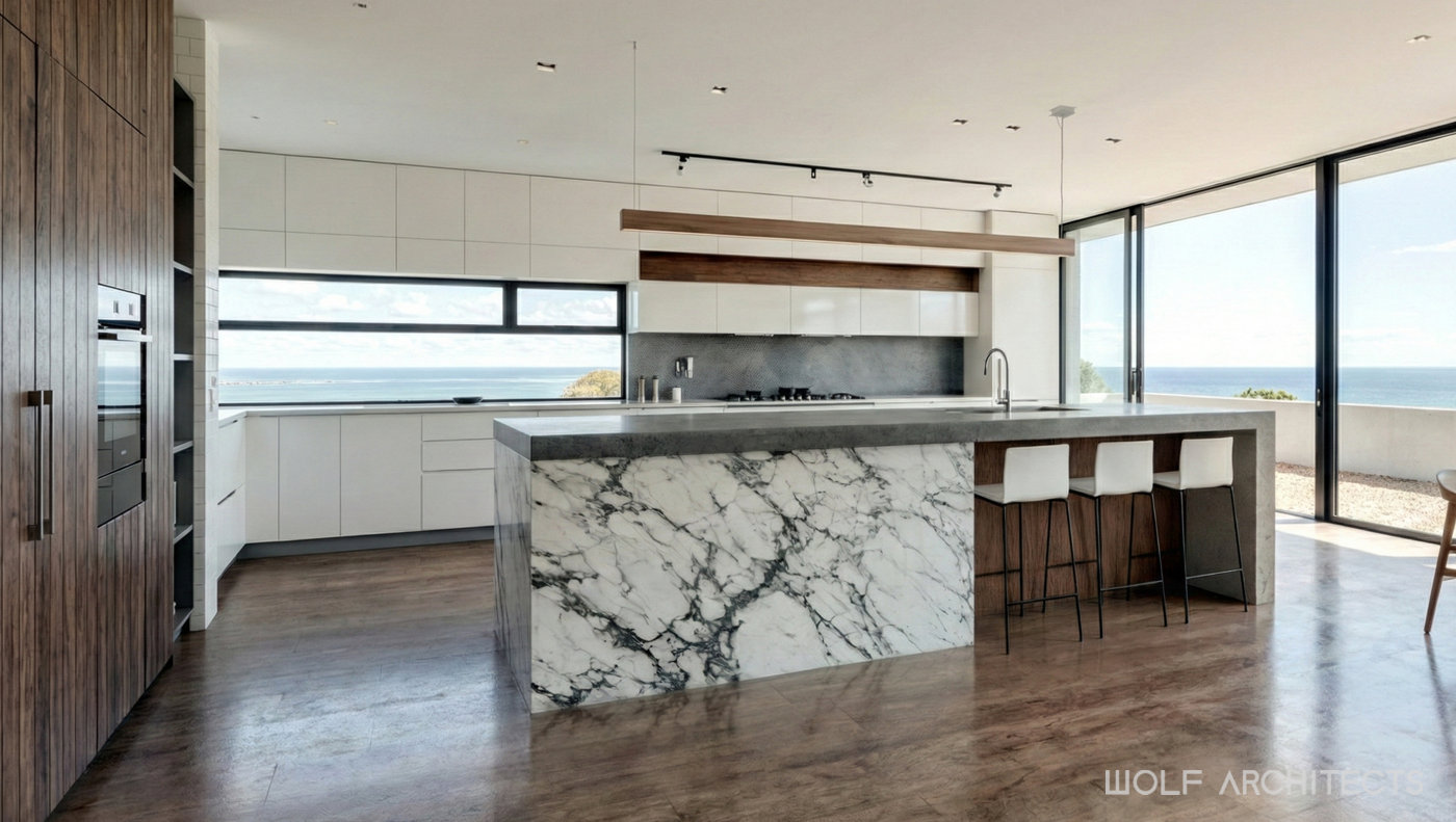 White was the predominant colour used, with a highly durable render to reflect upon the clients heritage and memories of the Greek Islands. Being a coastal site, WOLF Architects researched the materials from a practicality and maintenance perspective. As a holiday home, the building had to be able to be locked up and left idle for months without care or concern.