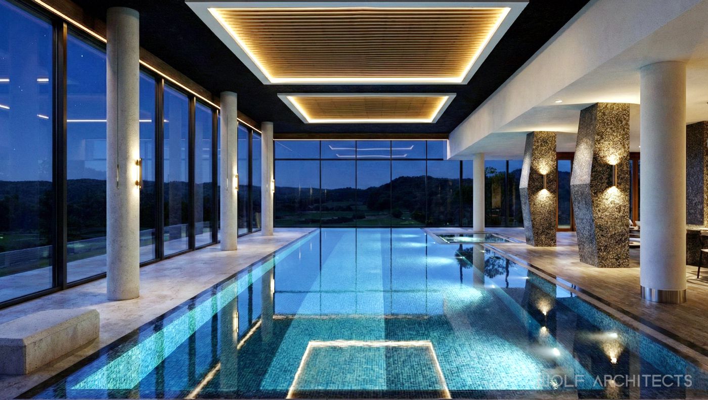 The rear of the house backs on to the family’s privately owned reserve with endless view of forest and lake. A stable at the rear accommodates several horses of which the family ride on their private estate. Most of the important spaces look out on the reserve. A large indoor pool with spa, steam room and sauna also capitalize on the views.