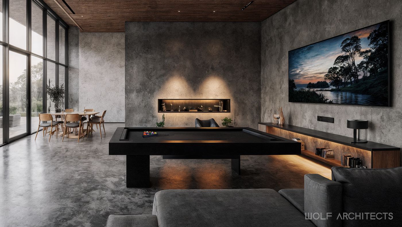 Whilst the brief did not require for the house to win awards as an architectural statement, it still does so due to the houses sheer size and simplicity of form. The bold use of concrete with WOLF ARCHITECTS signature beveled edge eaves makes for an elegant form with ample presence. The buildings hard edges are softened by the river and surrounding native tropical garden.