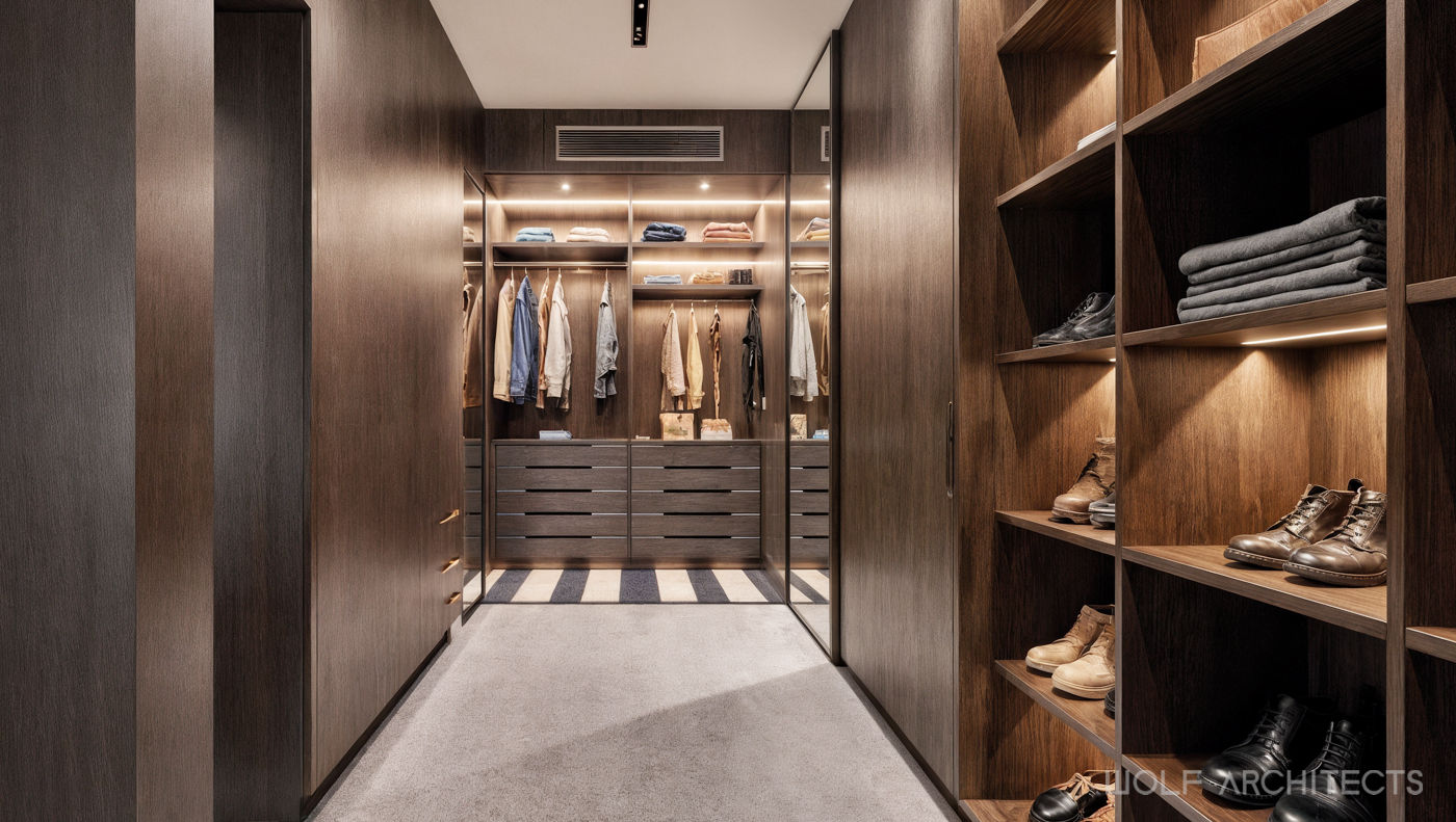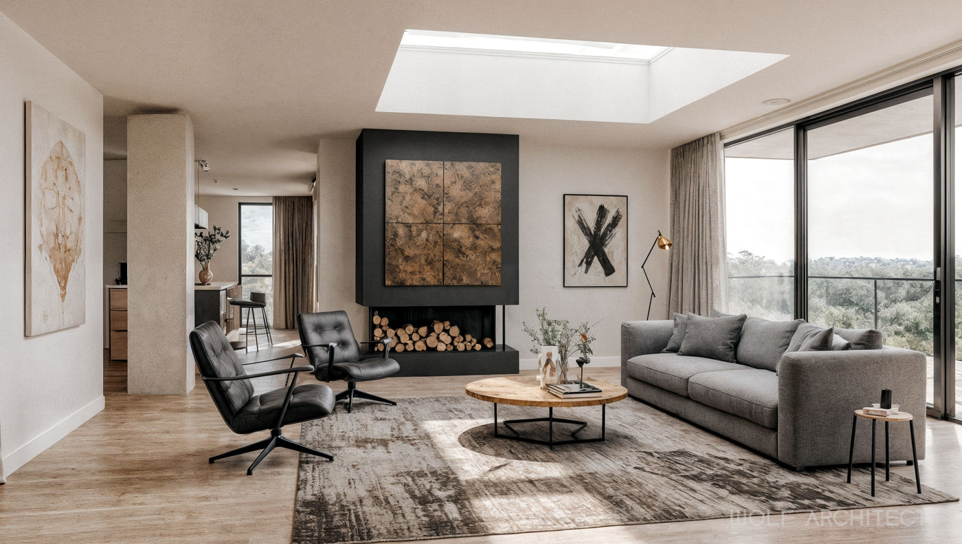 The Two Rock house, as the name suggests, sits in between two rocky formations on a hilltop site. WOLF Architects were able to overcome the challenges of a very difficult site and in turn, reap the benefits of the peculiar conditions. Careful studies of the site’s topography and rock foundations created the opportunity for an 8 car basement garage, large enough to accommodate a boat. Skylights placed in the grass funnel natural light directly into the basement, meaning artificial lighting is not as integral in comparison to most basement garages. Toward the rear of the property, there is a double story music studio, overlooking yet another stunning view the site presents. The upper floor is externally very private with minimal windows, however a large central courtyard filters light in. In the main living area below, a fireplace sits to the side of the space and is built from the brass of melted, combined and moulded Zildjian cymbals.